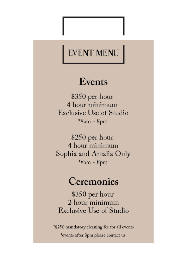 The Glasshouse Studios is more than a studio; it is your next magnificent event venue. The Sophia and Amalia studios together comprise a 1200 square foot space, ideal for hosting any number of intimate gatherings ranging from small weddings, bridal and baby showers, to festivities celebrating milestone occasions; to product launch parties, corporate holiday parties or board meetings. Our facility offers an abundance of free parking both at the front and rear of the building as well as a barrier-free bathroom and two-piece bathroom.